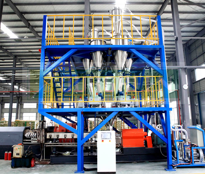 公司的自動上料系統(tǒng)采用特制的攪拌上料系統(tǒng),以確保各種原料混合的均勻。自動化控制保證系統(tǒng)運行穩(wěn)定,按照生產配方將各組分別加入到料倉中,經真空上料機后充分攪拌,后將攪拌均勻的物料加入到擠出機的料斗中。該產品由公司優(yōu)化設計,使其能夠適應各種型號的擠出機組。